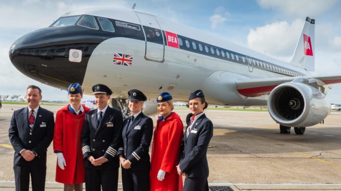The specially painted Airbus A319 G-EUPJ has been painted in the British European Airways (BEA) livery as part of the airlines 100 year anniversary, BA100.