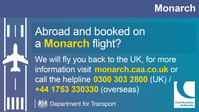 “We urge people affected by the company’s collapse to check our dedicated website monarch.caa.co.uk for advice and information on flights back to the UK.  It also gives information to those passengers that have future bookings with Monarch but are yet to leave the UK.”