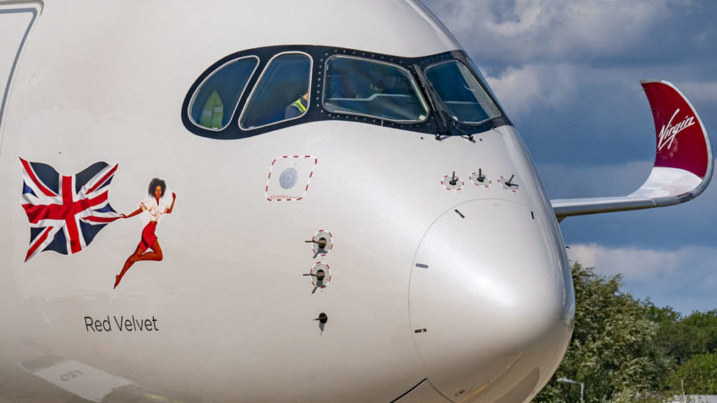 Virgin Atlantic (VS/VIR) has unveiled its new “Flying Icon” nose art on its brand new Airbus A350-1000XWB G-VLUX ‘Red Velvet’.
